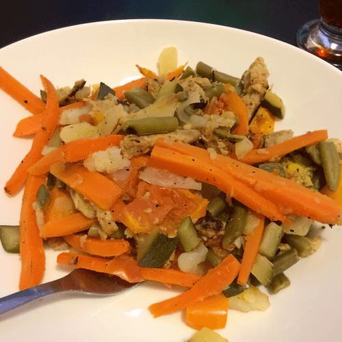 Бланшировать фасоль. Нарезать кубиками цукини. Морковь нарезать полосочками. Перец болгарский большими кусками. Луковицу разрезать на 2 части, потом на 8 частей. Помидоры нарезать большими кубиками.
