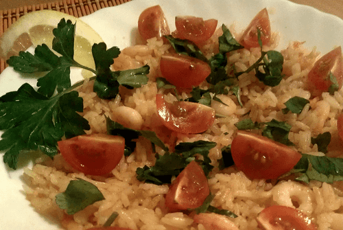 И так, помидоры черри нарезать пополам или на четвертинки (по вкусу), петрушку мелко нарезать. Выложить рис с креветками на блюдо, посыпать петрушкой и добавить помидоры. Подавать блюдо можно с долькой лимона и листочками петрушки.