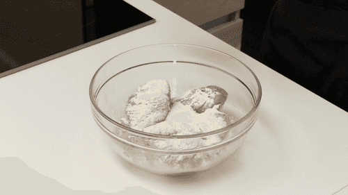 Разогреть духовку до 220 градусов. Ножки с кожей натереть солью и перцем, обвалять в муке.