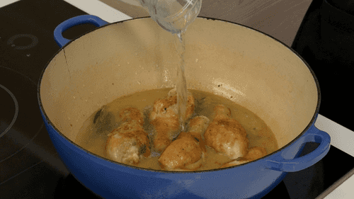 Влить вино, добавить розмарин и лаврушку. Готовить две минуты, упарив вино, затем влить полтора стакана воды и довести до кипения. Накрыть крышкой и отправить в духовку на сорок пять минут.