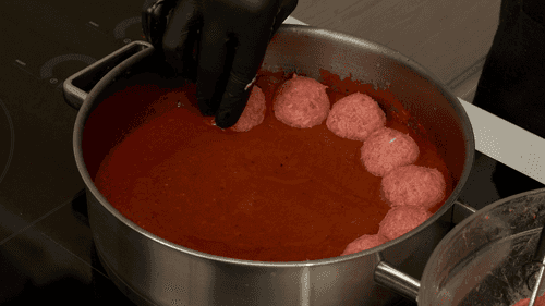 Снова поставить на средний огонь соус и довести до легкого кипения. Из фарша слепить небольшие фрикадельки и аккуратно погрузить в горячий соус. Тушить фрикадельки в умеренно кипящем соусе десять-пятнадцать минут. В конце посолить и поперчить по вкусу и подавать горячими.