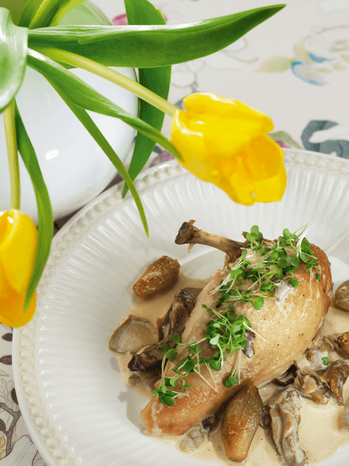 Куриное фрикасе с грибами — утонченное блюдо французской кухни, вобравшее в себя лучшие традиции гастрономии. Нежные куриные грудки, пропитанные ароматом тимьяна и лаврового листа, томятся в насыщенном грибном соусе на основе сливок. Лук-шалот, карамелизированный в сливочном масле, придает блюду тонкую сладость, а белые грибы — выразительную глубину вкуса. Фрикасе отличается мягкостью и шелковистостью текстуры, раскрывая богатые слои вкусов при каждом укусе. Идеально подходит для уютного семейного ужина или торжественного стола, подается с зеленью, усиливающей свежесть. Это блюдо воплощает гармонию простоты и элегантности, позволяя наслаждаться традиционным французским вкусом.