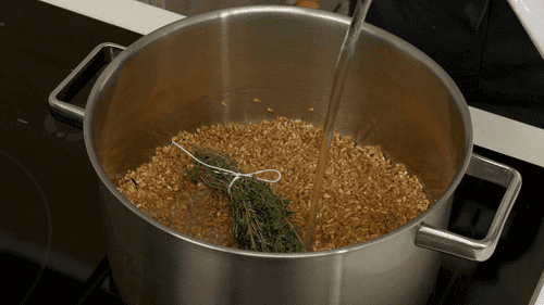 На среднем огне в глубоком сотейнике разогреть 2 столовые ложки растительного масла, добавить полбу и жарить, помешивая, в течение двух минут. Бросить тимьян (связанный пучком) и залить пятью стаканами воды. Накрыть крышкой и варить десять минут, затем добавить две чайные ложки соли и варить еще тридцать минут — до готовности. Откинуть на дуршлаг и остудить, тимьян выбросить.