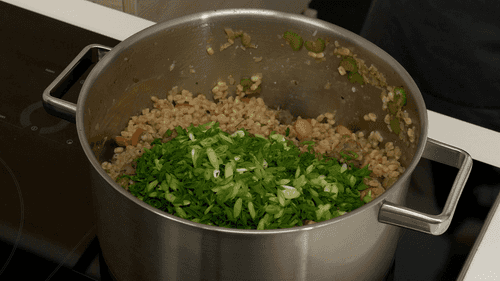 Добавить готовую полбу и готовить еще около пяти минут, пока жидкость полностью не впитается. В самом конце добавить измельченный лук и листья сельдерея.