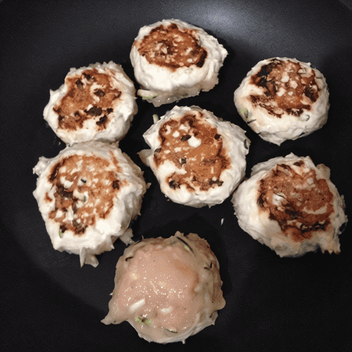 Формировать небольшие котлетки и жарить на сухой сковороде (без масла!) с двух сторон по 1 минуте.
