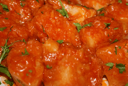 К этому времени духовка уже должна была нагреться, залейте мясо получившейся томатной смесью, равномерно распределив овощи по всей поверхности мяса. У меня в противне мясо полностью скрыто под слоем соуса и овощей, если у вас не хватает соуса на все мясо, смешайте еще томатной пасты и бульона и добавьте к мясу.