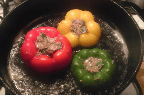 Фарш смешать со специями и положить в перцы, утрамбовать.