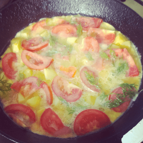 В миске взбейте вилкой яйца с зеленью (у меня укроп), влейте в сковороду и накройте крышкой.
