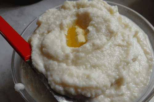 В горячее пюре добавить сливочное масло — количество зависит от вашей каллорийной озабоченности. Посолить и поперчить.