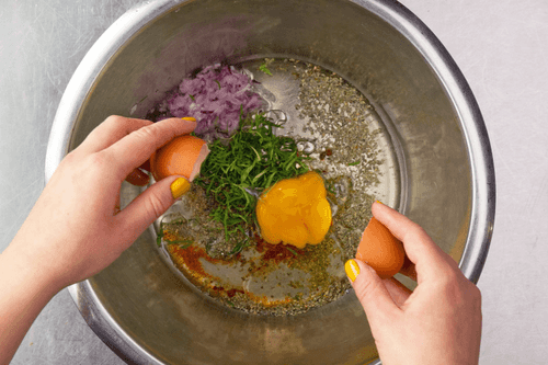 В миске смешать мяту, 2 столовые ложки масла, столовую ложку орегано, по 1/8 чайной ложки корицы и мускатного ореха, кайенский перец, мелко натертый красный лук, яйцо и желток. Посолить и поперчить.