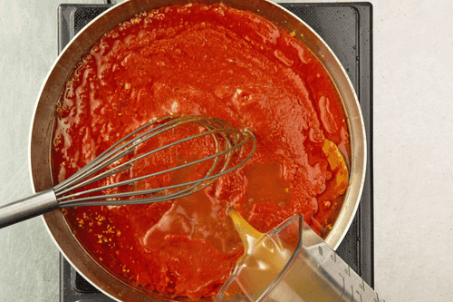 Оставшееся масло разогреть в сковороде, добавить измельченный чеснок и жарить минуту. Добавить томатную пасту и лаврушку. Консервированные помидоры без шкурки взбить в пюре и влить в сковороду, добавить оставшиеся специи и бульон. Варить на среднем огне, помешивая, двадцать минут.
