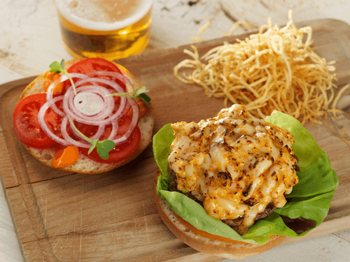 Булки разрезать надвое. На нижние половины выложить соус, листья латука, котлеты с сырным соусом. Добавить кольца красного лука, оставшиеся помидоры и кинзу. Накрыть другими половинами. Отдельно подавать картофель пай.