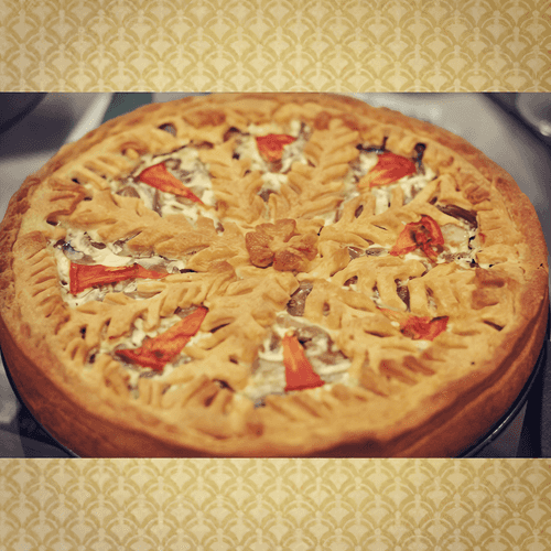 Из оставшейся второй части теста (той, которая была 1/3 от общего количества) делаем верхние украшения. Следует раскатать его на 8 одинаковых полосок по длине равных радиусу вашей формы. Каждую надсечь по обеим сторонам ножом и выложить симметрично на пироге. Еще несколькими полосками, надсеченными по одной стороне обрамить пирог по окружности. Слепить их краешки с бортиками. По середине можно сделать цветульку, а пробелы украсить тонкими ломтиками помидора. Но вариант украшения пирога может быть абсолютно любой, нет ограничений вашему творчеству и фантазии.