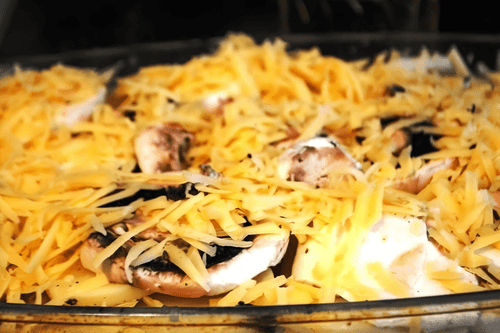 Противень смазать растительным маслом, выложить слоями: картофель (присолить), цукини, грибы (присолить, поперчить).