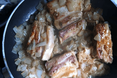 Выкладываем ребрышки на предварительно разогретую сковороду.
