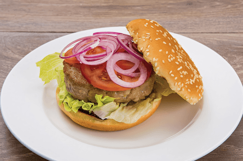 Смажьте булку оливковым маслом со стороны срезов и обжарьте на сковороде гриль на сильном огне до золотистого цвета; смажьте булку соусом, выложите салат, котлету, помидор и лук.