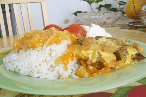 Выложить овощи в огнеупорную форму. На овощи выложить рыбу, тушеные грибы. Сверху добавить майонез и тертый сыр. Запекать в духовке, разогретой до 200 градусов около 20 минут.
