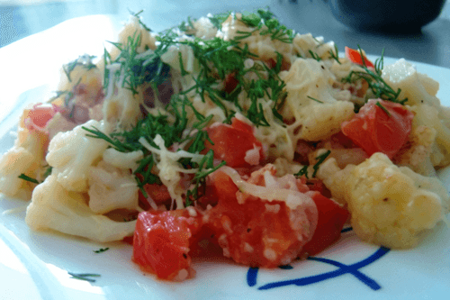 Цветная капуста с беконом и помидорами