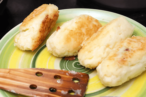 Из картофельной массы сформировать лепешки.На середину каждой положить сельдь чайную ложку, прижать края, придать руками форму пирожка.