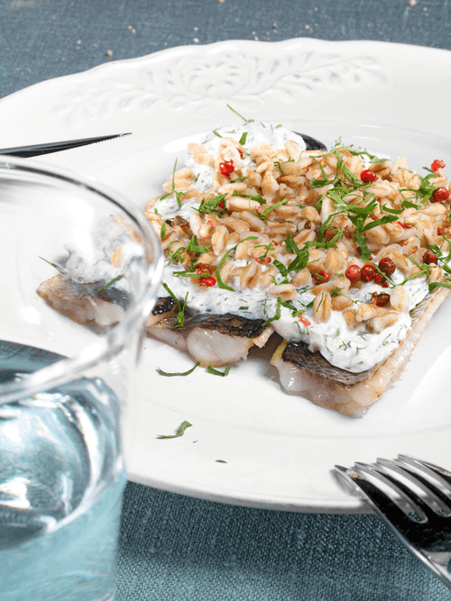 Полбу залить водой примерно на палец, кинуть в кастрюльку щепотку соли и варить на медленном огне двадцать минут, после чего снять с огня, накрыть крышкой и дать постоять десять минут. Выложить на тарелку рыбу, сверху сдобрить смесью огурцов и сметаны, посыпать полбой и розовым перцем, если нравится его кисловатый привкус.