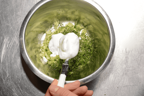 Натереть огурцы на мелкой терке, смешать с давленым чесноком, мелко нарубленным укропом, щепоткой соли, перца и сметаной.