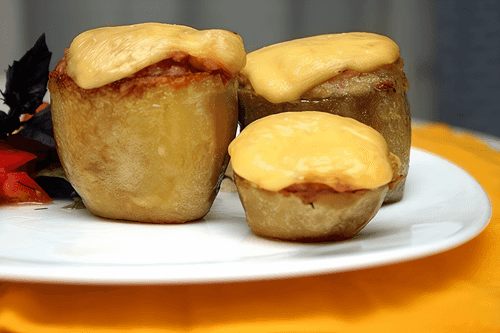 Лук потереть на терке и нарезать мелко ветчину. Все обжарить. Все смешать с отварным картофелем. Нафаршировать стаканчики из картофеля приготовленной массой. Нарезать тонкими ломтиками сыр и положить сверху, каждой картофелины. Разогреть духовку до 170 градусов. Запекать картофель при этой температуре 20–30 минут.