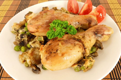 Куриные голени с шампиньонами и зеленым горошком