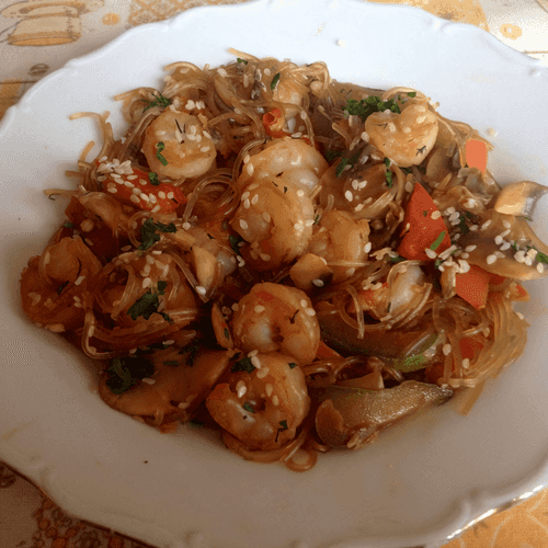 Фунчоза с креветками и овощами