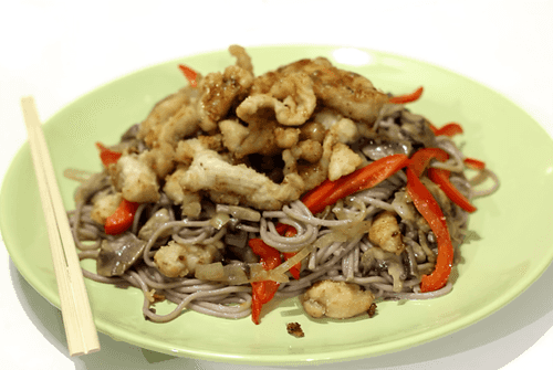 Тонко режем грудку и добавляем в неё три столовых ложки соевого соуса, мед. Перемешиваем и даем час промариноваться. Для остроты можно добавить чеснок. Соль, перец по вкусу.