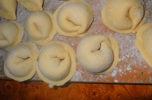 По прошествии времени раскатать пласт теста, вырезать стаканом небольшие кружки, в центр положить чайную ложку фарша, защипить края как на вареник, а потом склеить уголки.