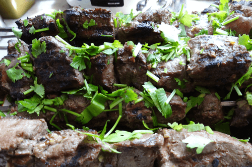 Шашлык из телячьей печени с коньяком — это роскошное сочетание нежного мясного вкуса и ароматной специевой пропитки. Этот рецепт берет свои истоки из русской кухни, где печень ценится за насыщенный вкус и питательные свойства. Маринад из коньяка, соевого соуса и чеснока делает печень мягкой и добавляет ей благородный оттенок. Быстрая обжарка на раскаленном гриле запечатывает сочность внутри, а свежая кинза и пикантный соус из сметаны с чили пастой дополняют блюдо яркими нотами. Такой шашлык идеально подойдет для дружеских встреч на природе, а также как оригинальная закуска на праздничном столе. Его вкус — это игра контрастов: мягкость печеночного мяса, насыщенность маринада и острота соуса создают гармоничный баланс, который запоминается с первого кусочка.