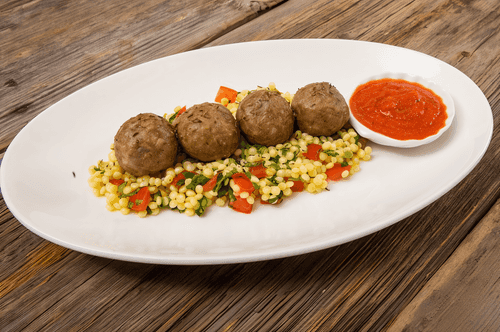Смешайте отваренный птитим с помидорами и зеленью, влейте сок, оставшийся после запекания митболов, посолите, поперчите, добавьте 1 ст.ложку оливкового масла, перемешайте.