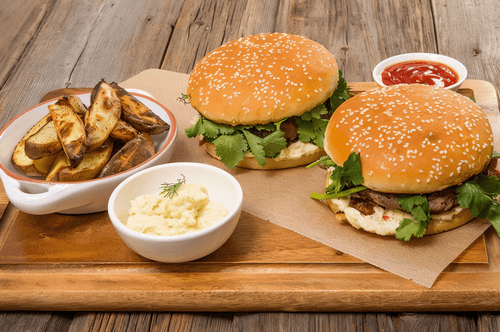 Подавайте бургеры с картофелем, кетчупом и оставшимся соусом.