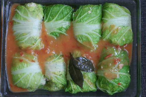 Залейте голубцы соусом, обсыпьте хлебными крошками, положите сверху лавровый лист и запекайте, пока соус не закипит и не начнет формироваться золотистая корочка.