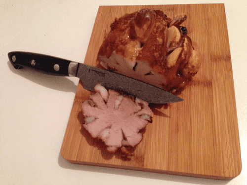Сделать в свиной лопатке надрезы в количестве 10 штук, засунуть в получившиеся кармашки чеснок.