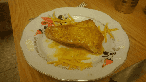 Выложить стейки на тарелку, полить соусом, украсить полосками цедры.