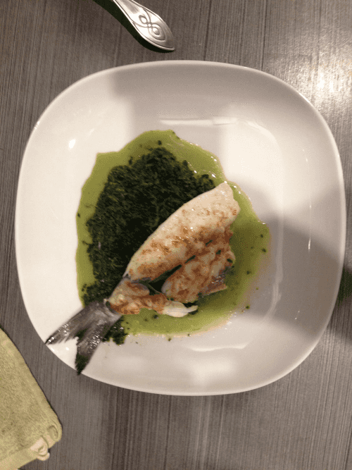 Дорада, припущенная в вине, на подушке из шпината со сливками