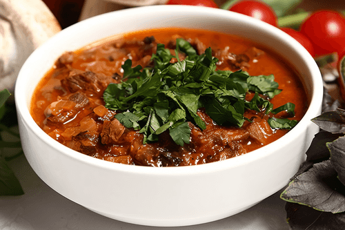 Солянка по-абхазски — это ароматное и насыщенное блюдо русской кухни, привнесшее в себя грузинские нотки специй и зелени. Густой мясной суп, приготовленный на основе говядины, томатной пасты и душистых приправ, отличается насыщенным вкусом, в котором гармонично переплетаются кисловатые, пряные и пикантные оттенки. Хмели-сунели и кориандр добавляют восточную теплоту, а кинза и петрушка придают свежесть. Особенность солянки заключается в ее медленном тушении, благодаря которому мясо становится невероятно мягким и сочным. Блюдо идеально сочетается со свежим хлебом и отлично согревает в холодное время года. Это не просто суп — это кулинарное произведение, в котором каждая ложка раскрывает новые грани вкуса и истории. Попробовав его, невозможно забыть его яркий и насыщенный характер.