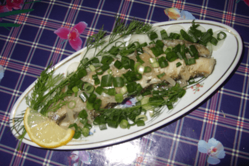 Выкладываем рыбу на блюдо и посыпаем зеленым луком. Сверху украшаем зеленью.
