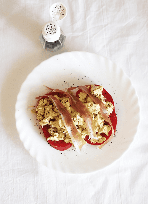 Яичница-болтунья с песто и прошутто — элегантное сочетание простоты и утонченности итальянской кухни. Воздушные, нежные яйца, обогащенные сливками, приобретают бархатистую текстуру, а ароматный соус песто привносит свежие травяные нотки базилика, чеснока и сыра. Прошутто добавляет благородную соленую ноту, создавая гармоничный баланс вкусов. Этот завтрак словно пробуждает вкус к жизни, наполняя утро теплом и насыщенностью средиземноморских ароматов. Блюдо подается с сочными ломтиками свежих помидоров, которые добавляют легкую кислинку и освежают композицию. Идеально подходит для неспешного завтрака с чашкой ароматного эспрессо, напоминая о солнечных улочках Италии, где еда — это не просто прием пищи, а настоящее искусство наслаждения.