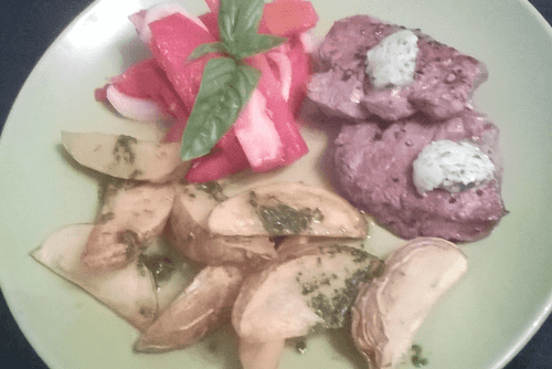 На тарелку выложить медальоны, на них положить базиликовое масло, рядом — артофель и помидорный салат, украсить базиликом.