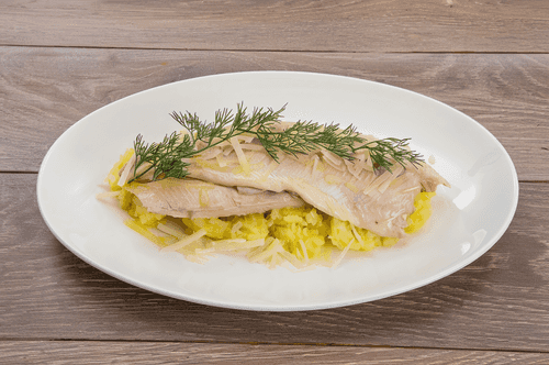 Выложите филе рыбы и картофель на тарелку, картофель полейте 1 чайной ложкой оливкового масла и посыпьте пармезаном, украсьте рыбу укропом и подавайте.