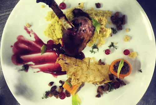 Подаем: намазываем готовый горячий соус на тарелку, выкладываем кашу, на нее — готовую гусиную голень, рядом рулетики из моркови, шкварки, свежие ягоды, зелень.