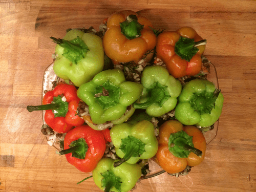 Перец, фаршированный запеченными овощами с рисом и чечевицей