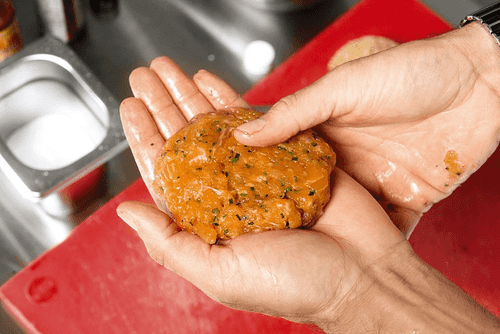 Три четверти семги превратить в мелкий фарш с помощью мясорубки, оставшееся — нарубить мелкими кубиками. Добавить вустерширский соус, лук-резанец, луковый порошок, копченую паприку, по вкусу посолить. Тщательно перемешать, чтобы получилась плотная однородная масса.
