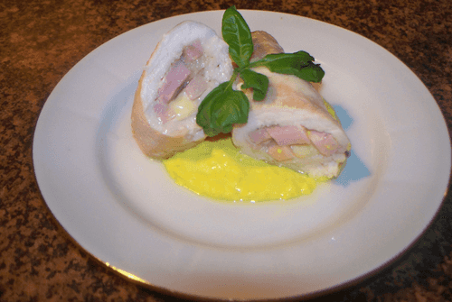 На куриное филе выложить сыр, бекон и базилик (мелко рубленный). Аккуратно подвернуть бока, чтобы начинка не вытекла и свернуть рулетом.