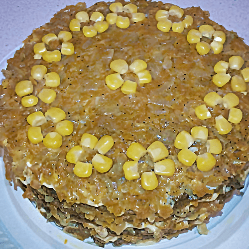 Торт из печени с рисом — удивительное сочетание вкусов и текстур, которое покоряет с первого кусочка. Этот рецепт берет корни из европейской кухни, где печень традиционно ценится за свою насыщенность и полезные свойства. Мягкие, воздушные блинчики из печеночного теста, прослоенные ароматной начинкой из риса, яиц и обжаренных овощей, создают многослойное гастрономическое удовольствие. Майонез и специи добавляют пикантности, делая вкус насыщенным и гармоничным. Блюдо идеально подходит для праздничного стола или уютного семейного ужина. Благодаря своей нежной текстуре и богатству вкусовых оттенков, этот торт является отличной альтернативой традиционным закускам и горячим блюдам. Его можно подавать как холодным, так и теплым, наслаждаясь каждым слоем сочного, ароматного шедевра.