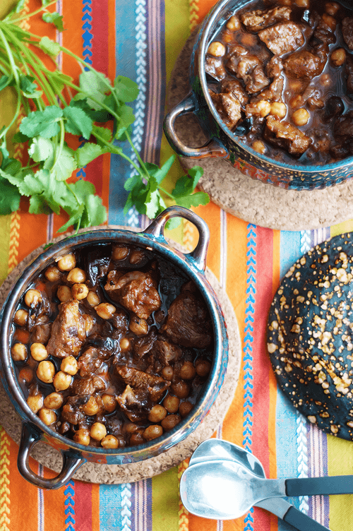 Добавить тертые томаты и горячий бульон к нуту, довести до кипения. Выложить баранину в кастрюлю вместе со всеми соками и чернослив, размешать получившийся соус и отправить в духовку. Если посуда не подходит для духовки, переложите соус в подходящую, например, горшки для чанахов. Мясо должно быть полностью покрыто жидкостью.