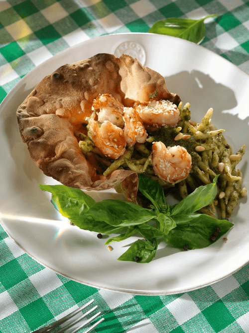 Трофие с песто и креветками — изысканное блюдо итальянской кухни, которое объединяет нежную домашнюю пасту, ароматный песто и сочные креветки. Трофие, традиционная паста из региона Лигурия, вручную формуется в характерные спиральки, идеально удерживающие соус. Песто, приготовленный из свежего базилика, оливкового масла, чеснока, кедровых орехов и козьего сыра, придаёт блюду насыщенный вкус с ореховыми и травяными нотками. Обжаренные тигровые креветки добавляют сочности и морской свежести. Это блюдо — воплощение средиземноморской гармонии, где мягкость пасты дополняется ароматной зеленью и хрустящей текстурой морепродуктов. Трофие с песто и креветками идеально подходит для уютного ужина или праздничного стола, предлагая вкусное путешествие в итальянские кулинарные традиции.