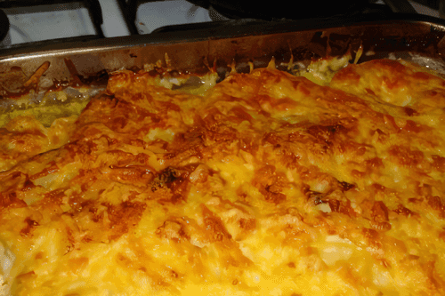 Сверху на мясо выложить нарезанный кольцами лук и посоленный.